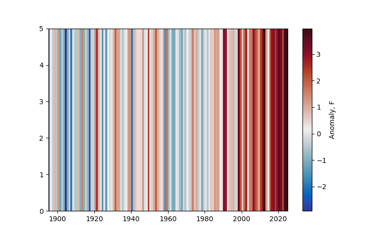 This plot shows the climate stripes for Maryland, USA, with labels for the horizontal axis in years and the colorbar in degrees Fahrenheit. The vertical axis label is not meaningful (it is inches).